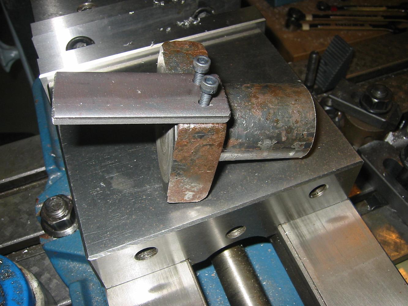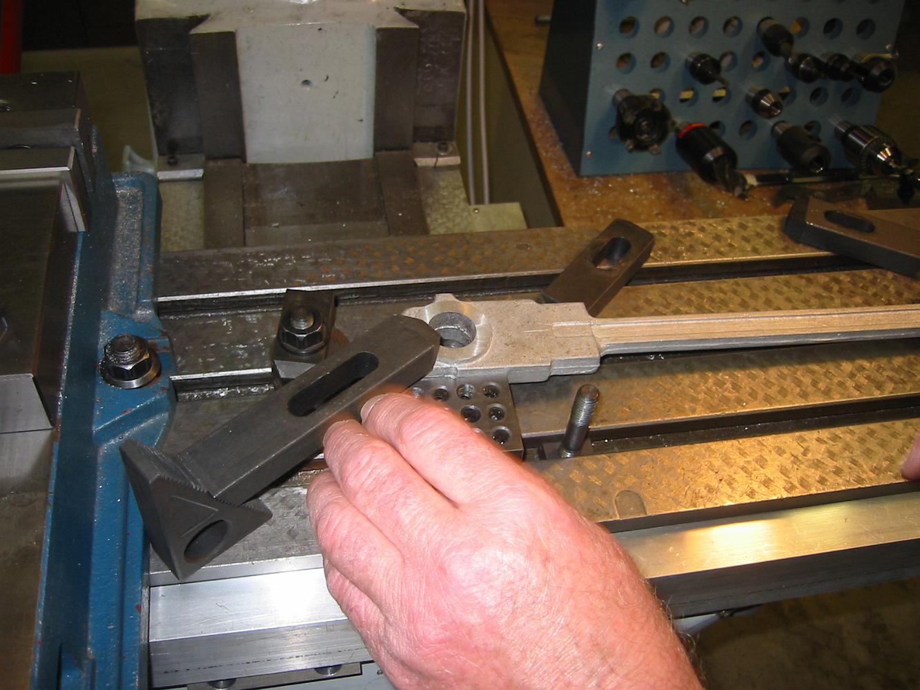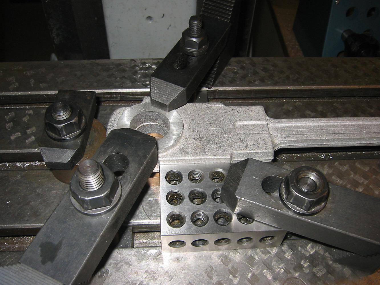 The set up to drill the crosshead end of the main rod. The fixture is the same height as the parallel at the other end.