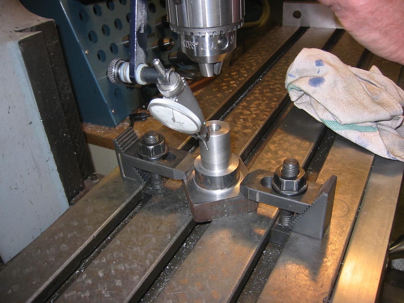 Having bolted the fixture to the table, we indicate all around to center and make sure it is perpendicular to the table. A minor adjustment to the Bridgeport…