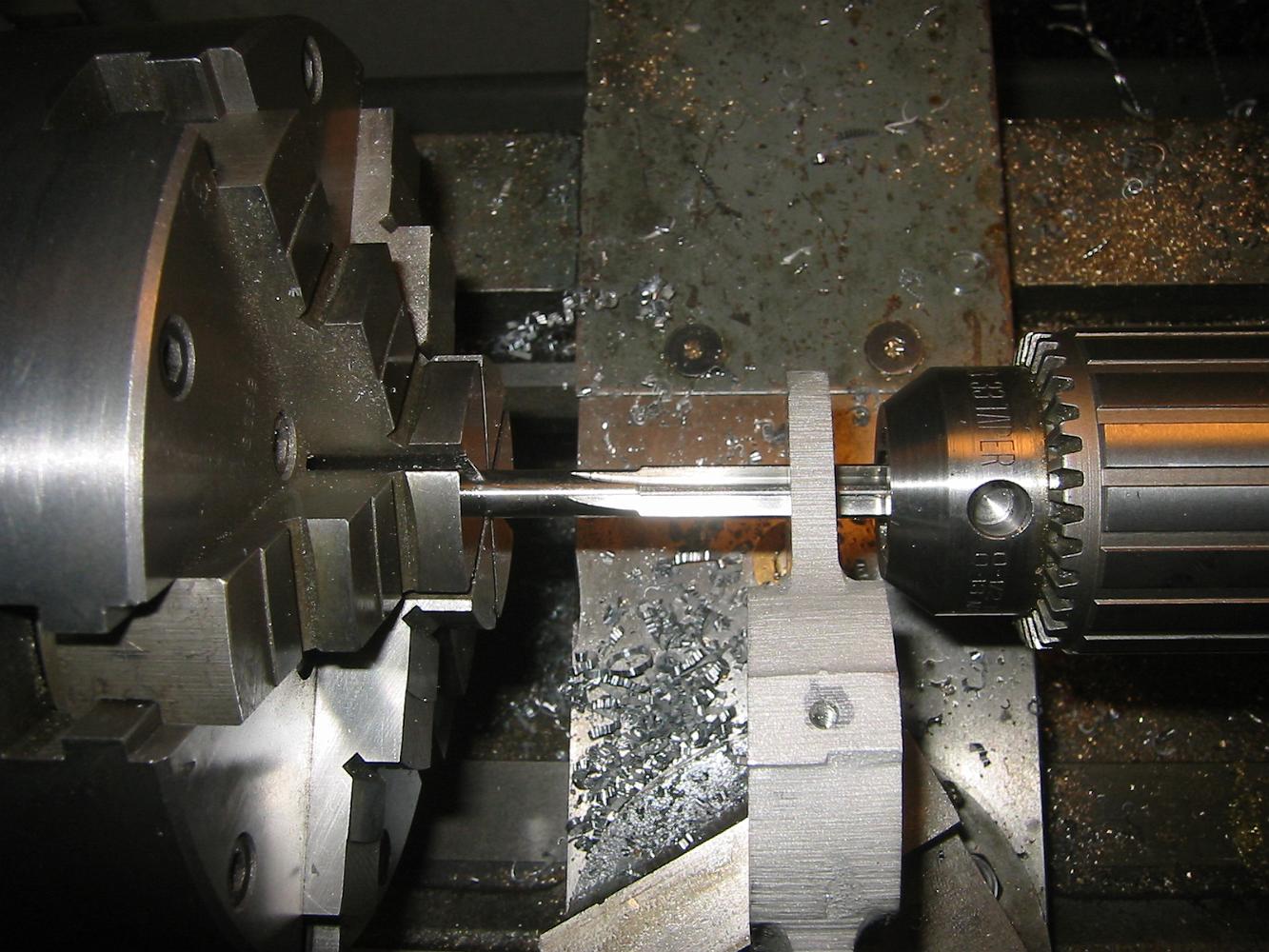 11-June-08 With the end rod securely held at the crankpin end, under the stack of washers on the tool holder, the other end is drilled so we can tap and bore…
