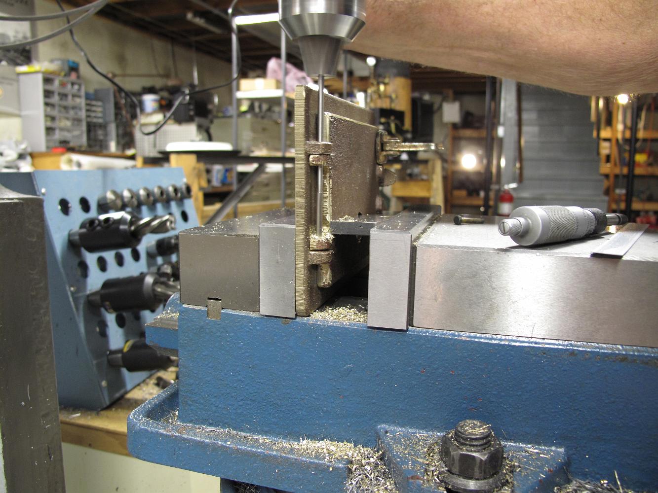 Drilling the hinge pin holes. Note use of parallel in horizontal position to hold the assembly, the casting finish is too rough for the vise to solidly hold it…