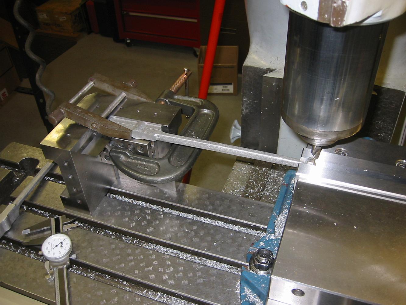 Clamping attempt #1 for the left Tumbling Shaft Lever. This did not have enough support to keep the part from moving under the cutter.