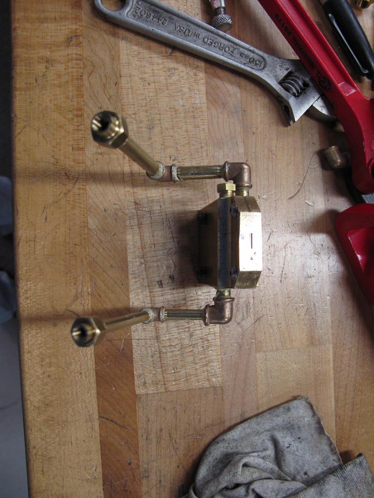 5-Sept-2011 Cleaned up Backhead manifold after silver soldering on some firebricks. I held the Mapp gas torch to the brass bar stock, Bill held the propane…