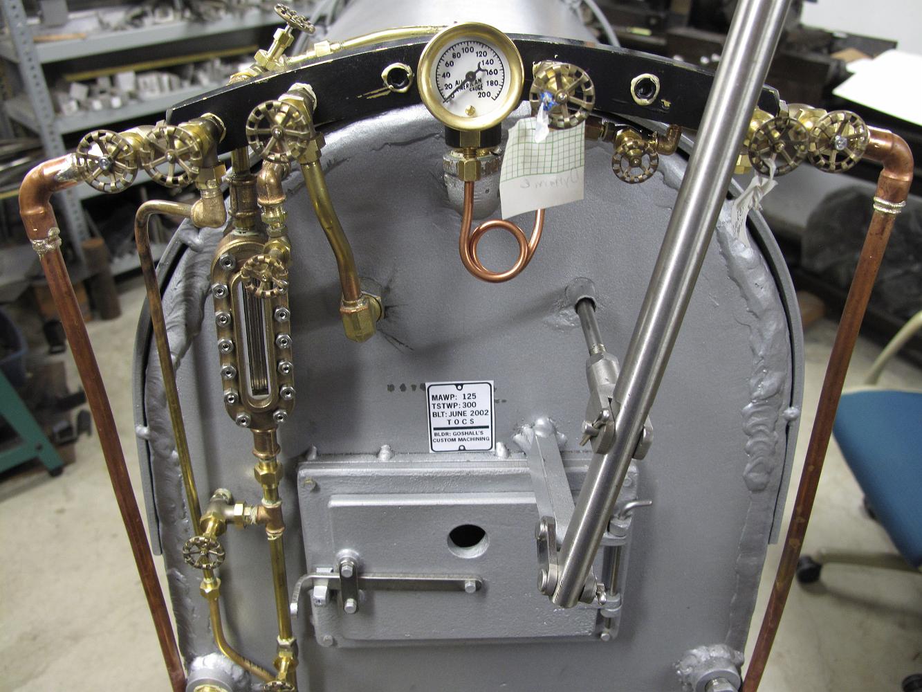 24-Oct-2011 Back to assembly! The now shorter manifold is (re)-installed on the boiler. On the right the main steam gage fittings have been installed, on the…