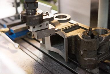 In the Summer of 2003, Bill W., took the rough milled cylinder saddle halves and machined them for me. Here, on one of many angle plate setups, he cuts the…