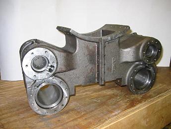 6-Sept-03 Bottom view of the cylinder saddle. The frame will bolt to the inside of the piston cylinders. It looks like the castings are mismatched in the…