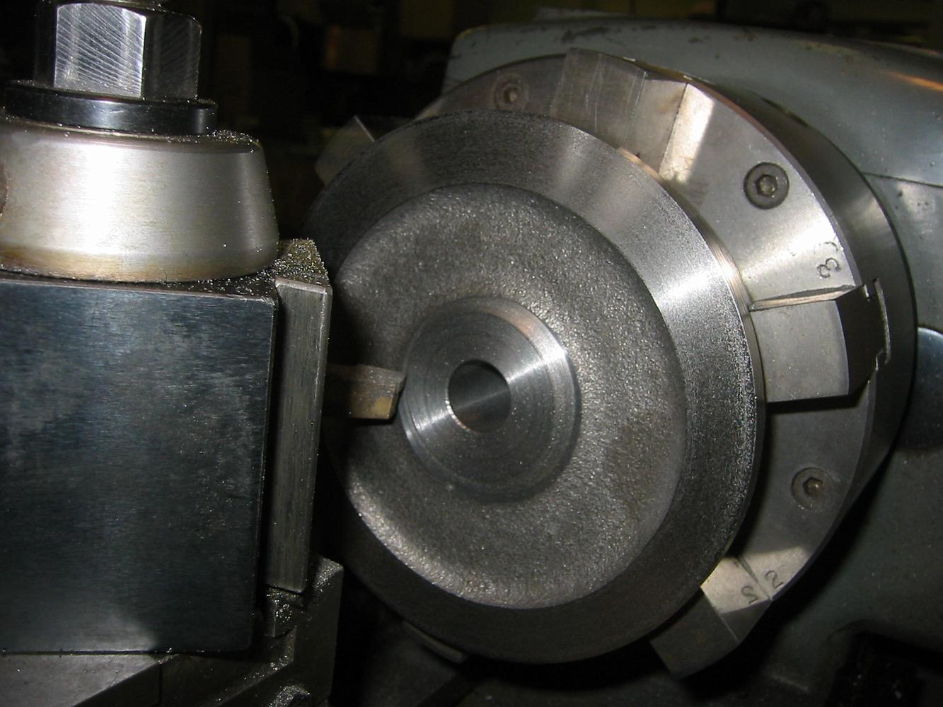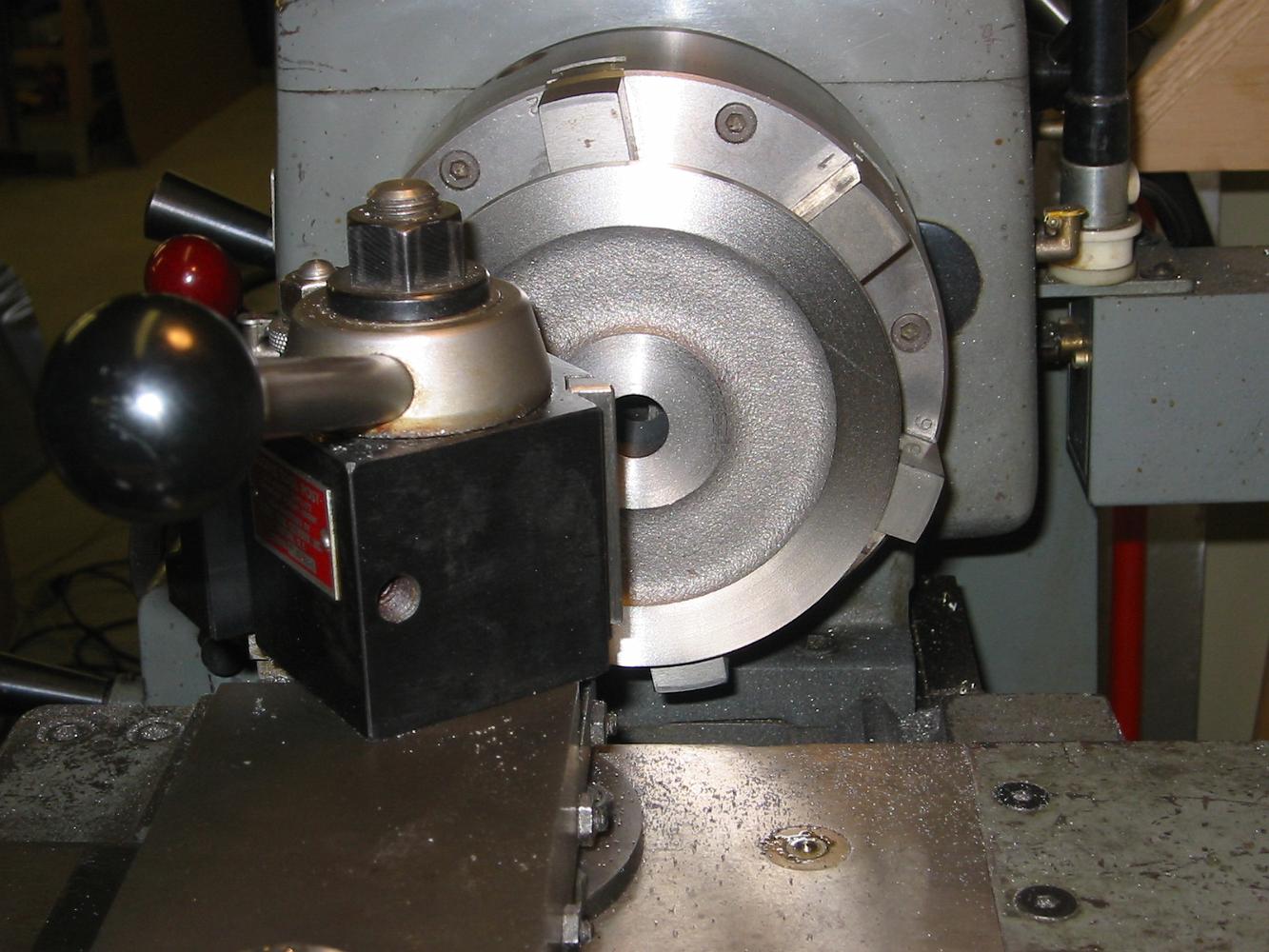 Checking the runout on the second chucking. Since this is a 'adjust-tru' six jaw chuck, we can center the wheel within a couple of thou.