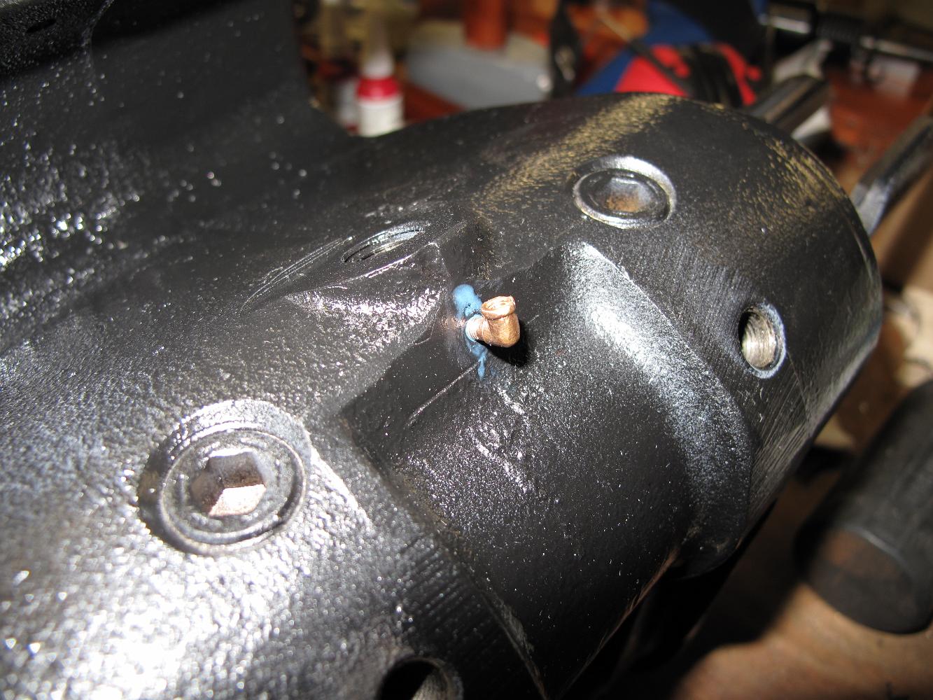 30-Sept-09 The tiny 1/8-56" street el for the lubricator line is screwed in and Loctited to the cylinders. Next we mount the cylinder jackets.